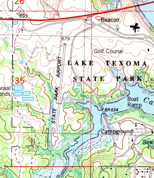 The earliest topo map depiction which has been located of Lake Texoma State Park Airport was on the 1984 USGS topo map.