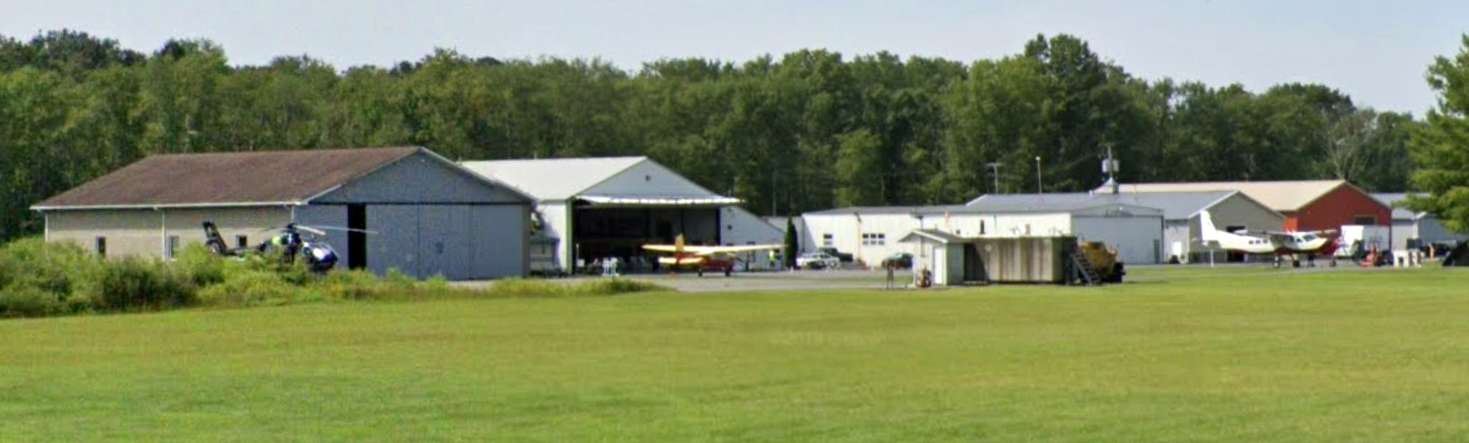 An August 2019 photo looking west at a helicopter, other aircraft, and hangars at Stroudsburg-Pocono Airport.