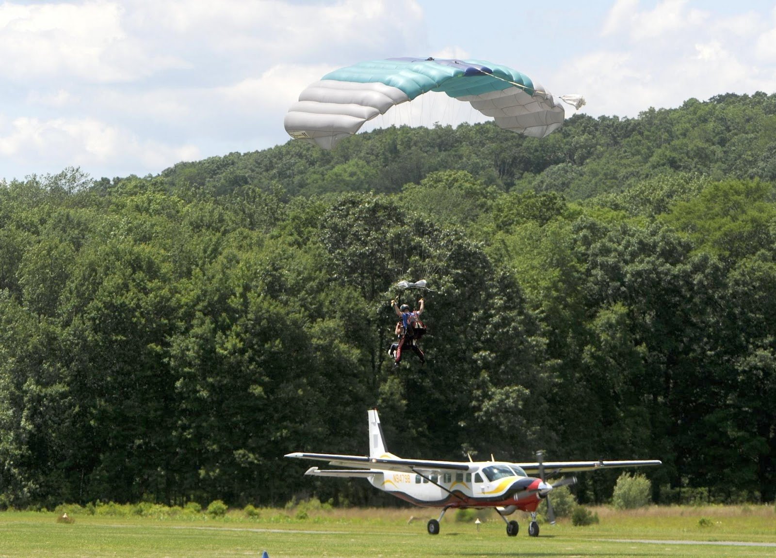 A 2017 photo of a skydiver landing in front of a Cessna Caravan taxiing at Stroudsburg-Pocono Airport.