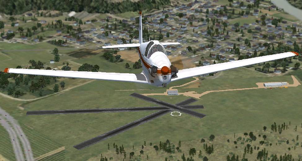 It depicted 2 grass runways & a white airport circle marking, along with the edge of a hangar on the northeast side.