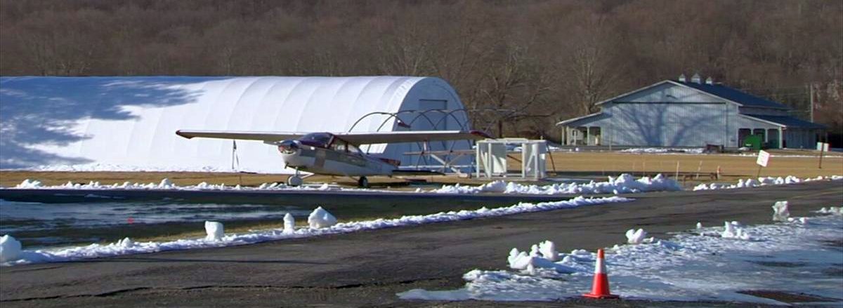 A 3/7/22 photo by Rich Amon of the exterior of the clamshell hangar at Stroudsburg-Pocono Airport.