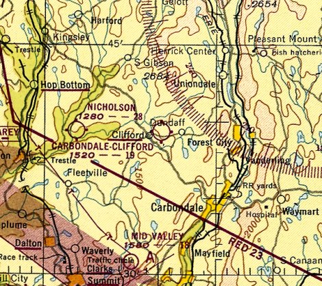 The directory depicted Scranton Airport as having two 2,500' grass runways, and a single hangar on the east side of the field.