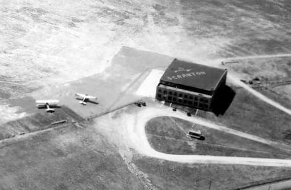 A 6/4/39 aerial photo (from PennPilot) depicted Scranton Municipal Airport as having 2 paved runways, with a hangar on the northeast side on which “Scranton” was painted.