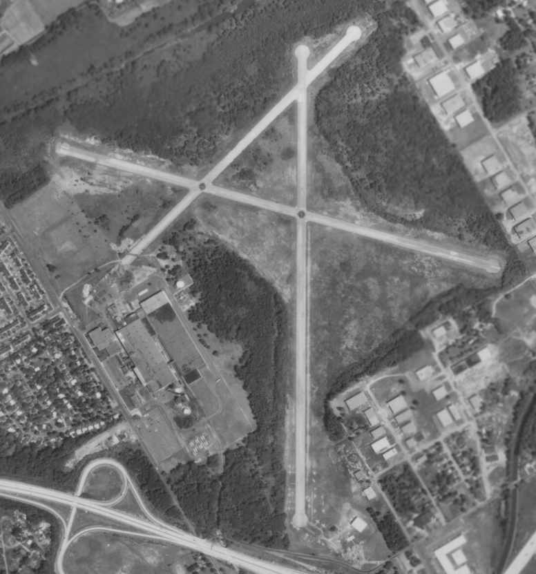 A 10/7/11 aerial photo, showed that 2 of the runways from 3M Airport had been reused as streets.