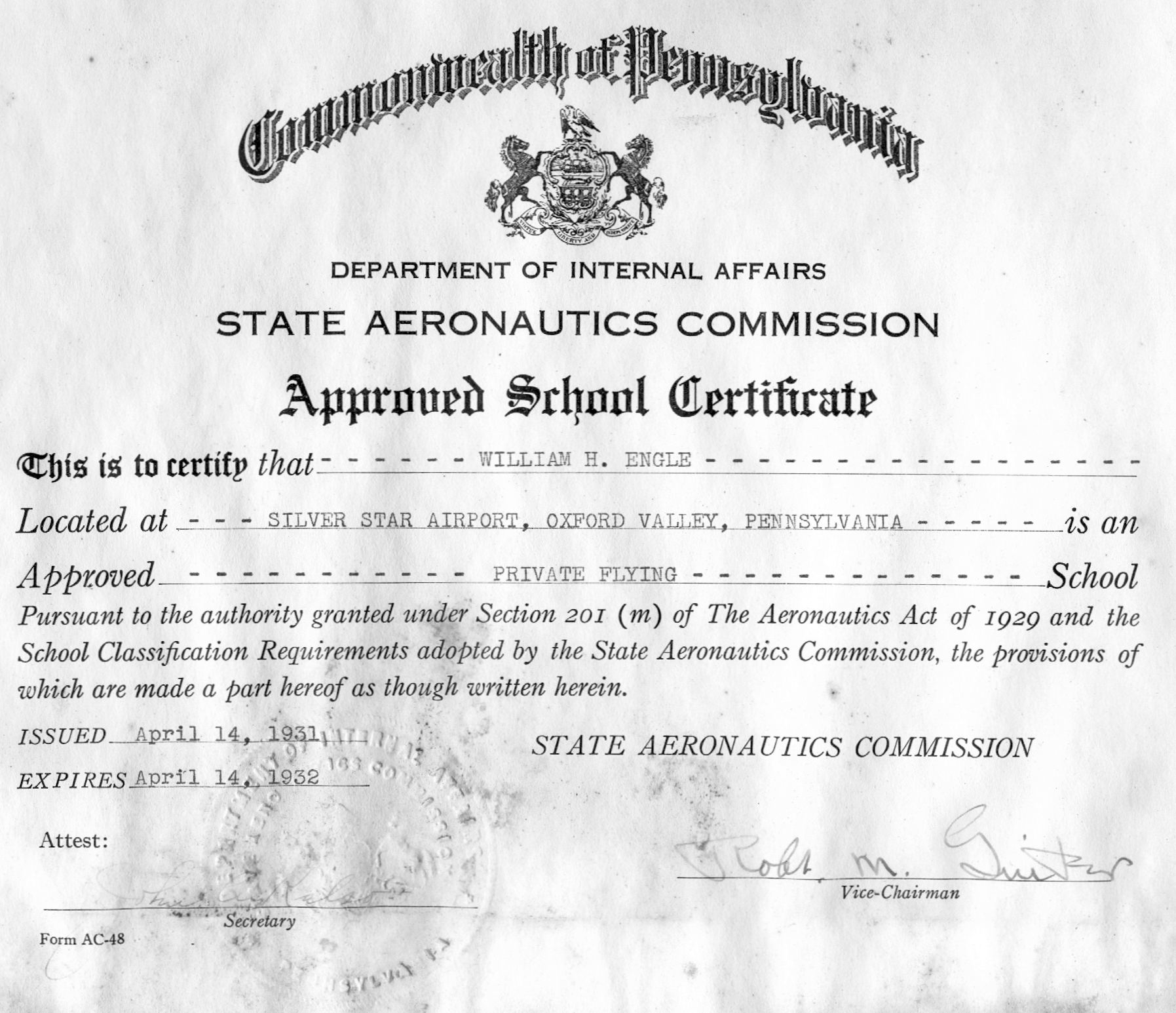Diane Siesel Orr recalled, “My father, William Siesel, operated an airport on Pennsylvania Avenue, Morrisville, in 1945-47.