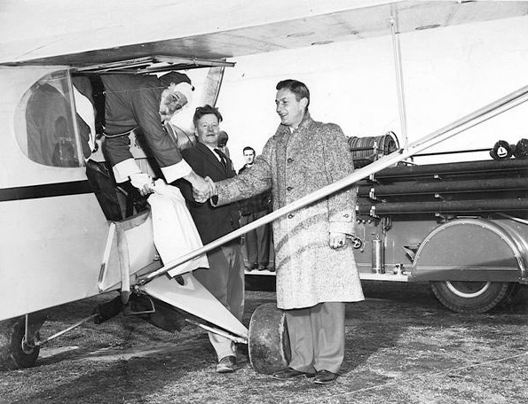A circa early 1950s photo of Santa arriving at Morrisville Airport in a Piper Cub (courtesy of Robert Hedden).