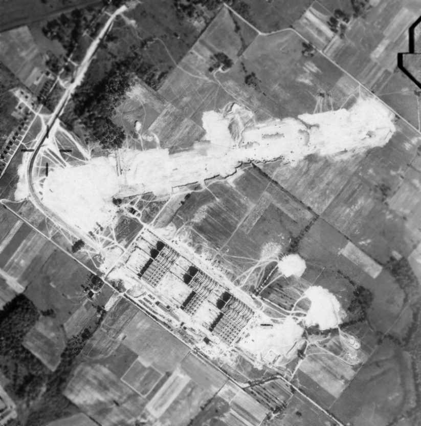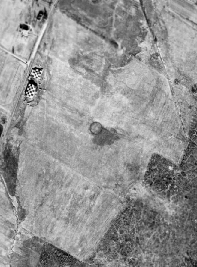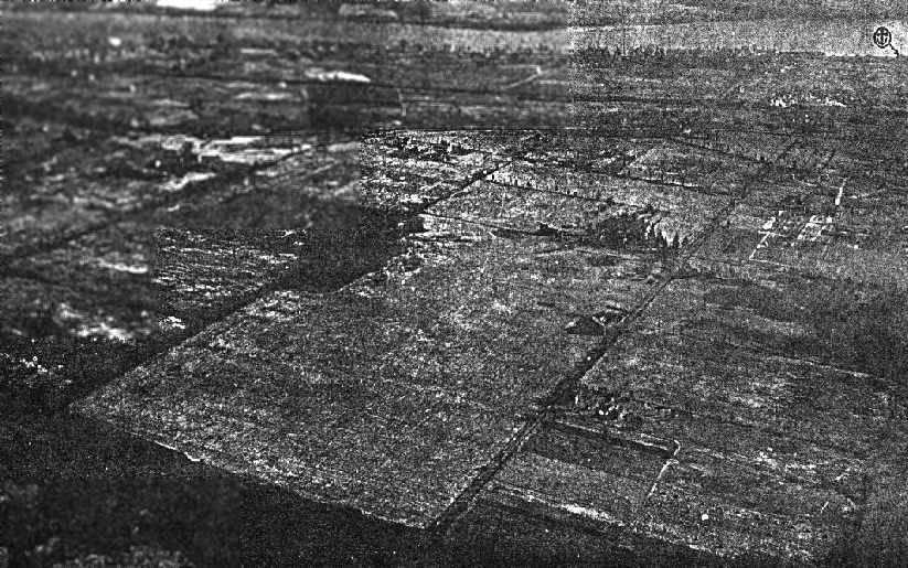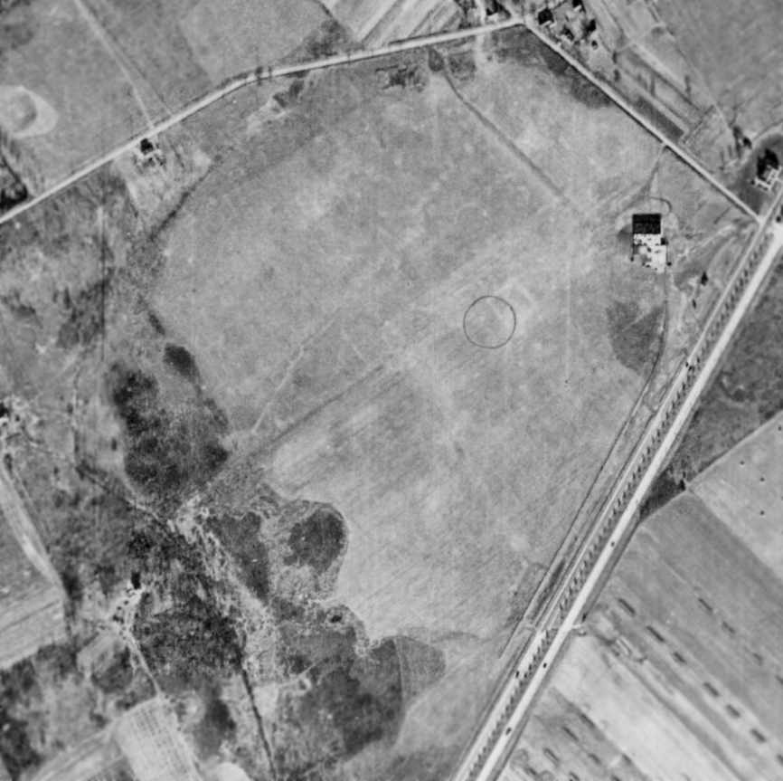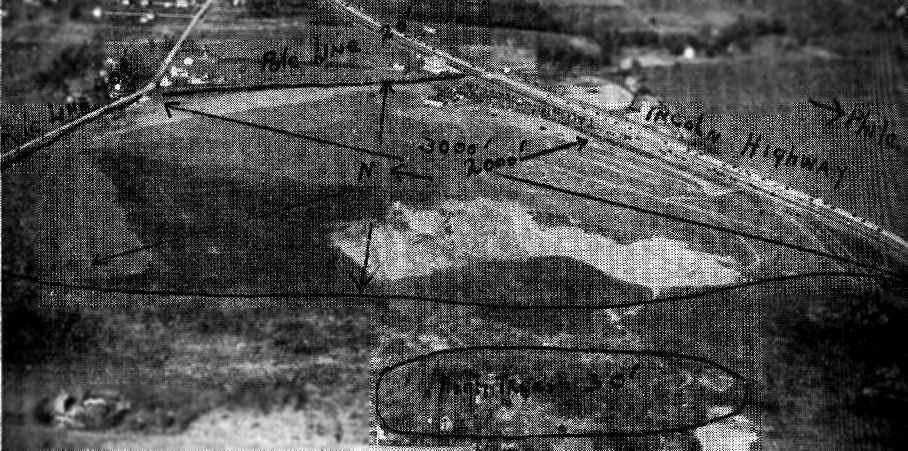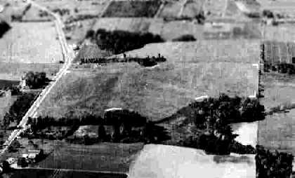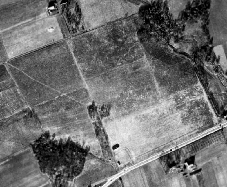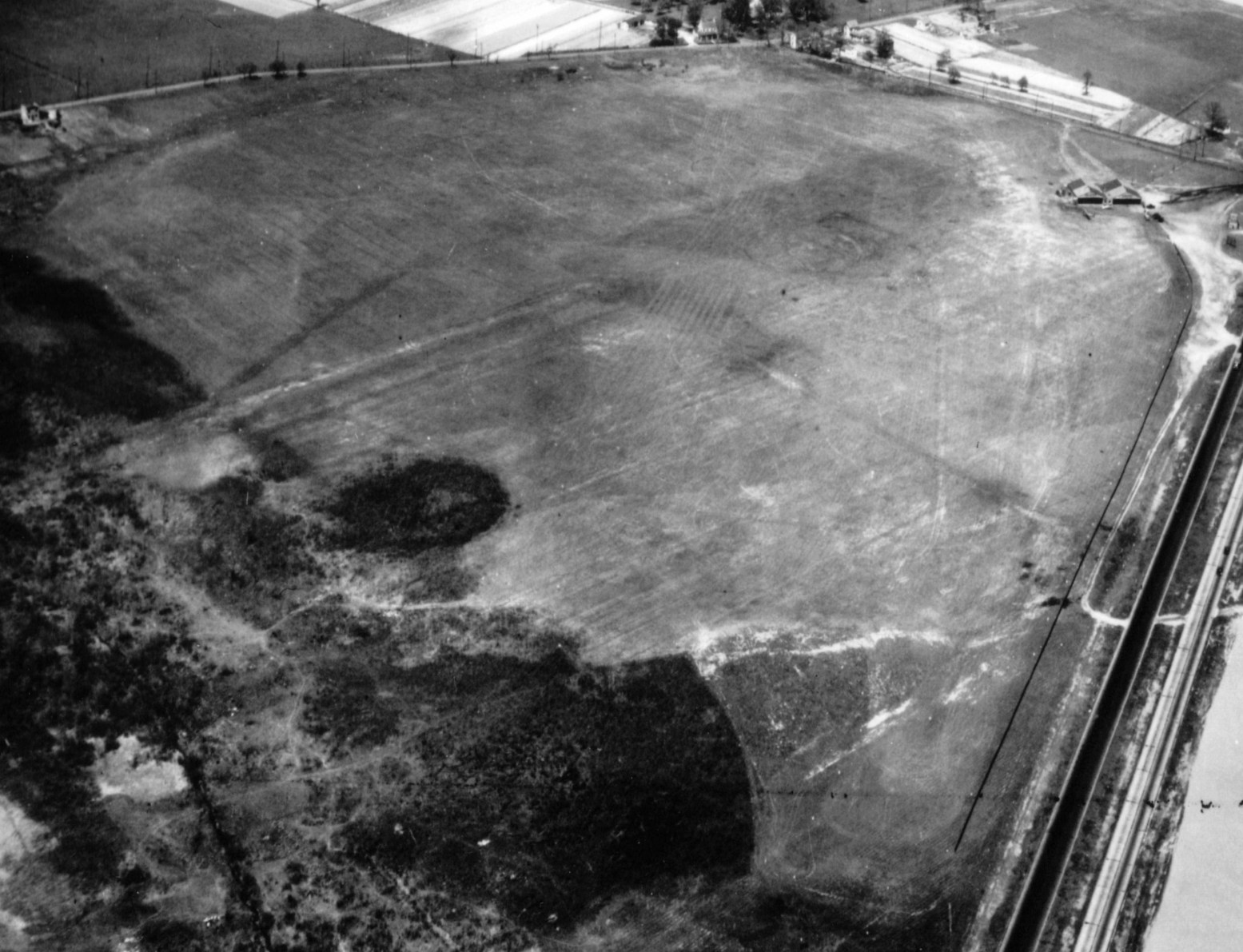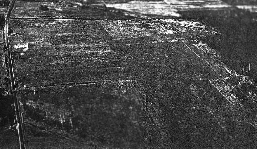 as a 1953 aerial photo showed railroad lines had been built through the center of the field,