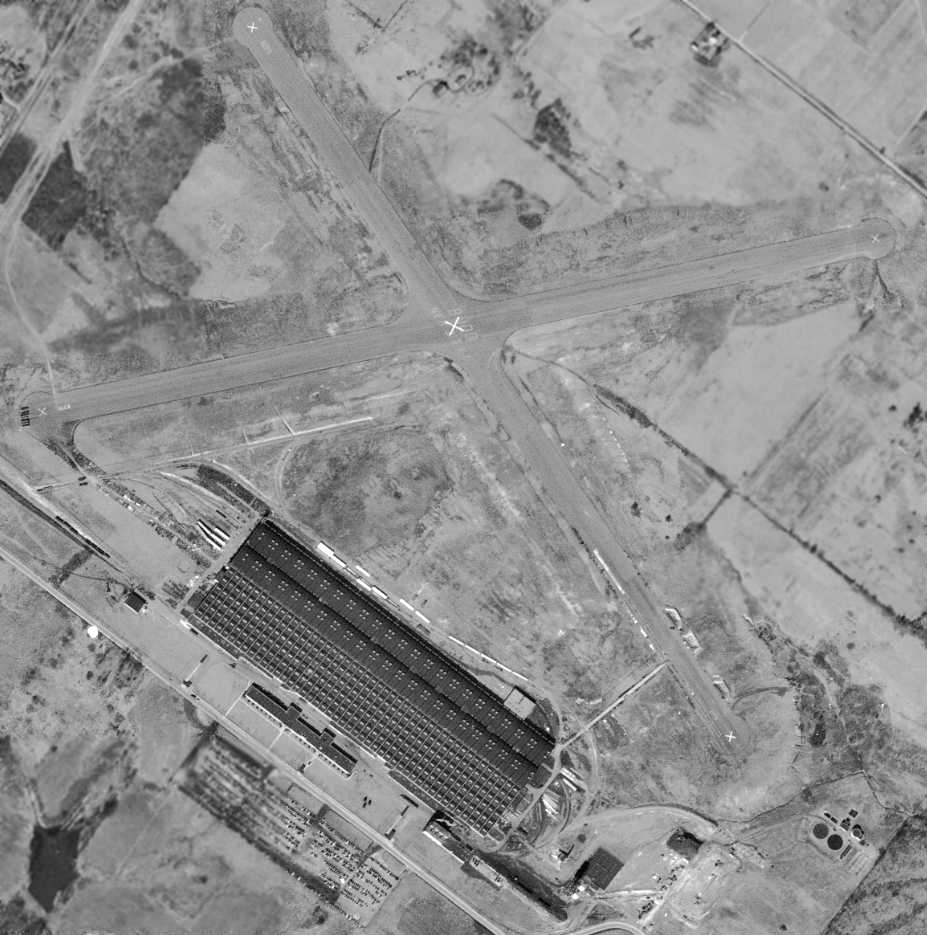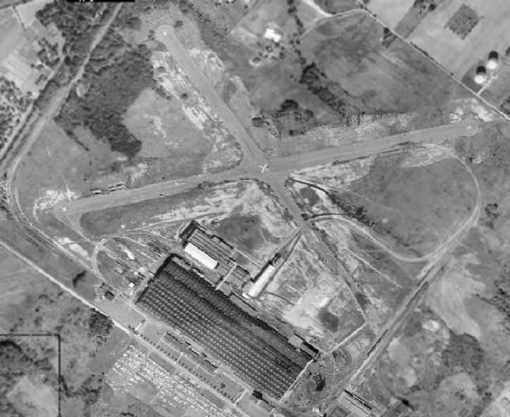 A 1999 aerial view showed that the hangar remained standing on the southeast side of Runway 1.