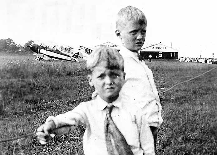 A 1956 photo by Joe Lyons II of Joe Lyons III in front of the Morrisville Airport hangar,