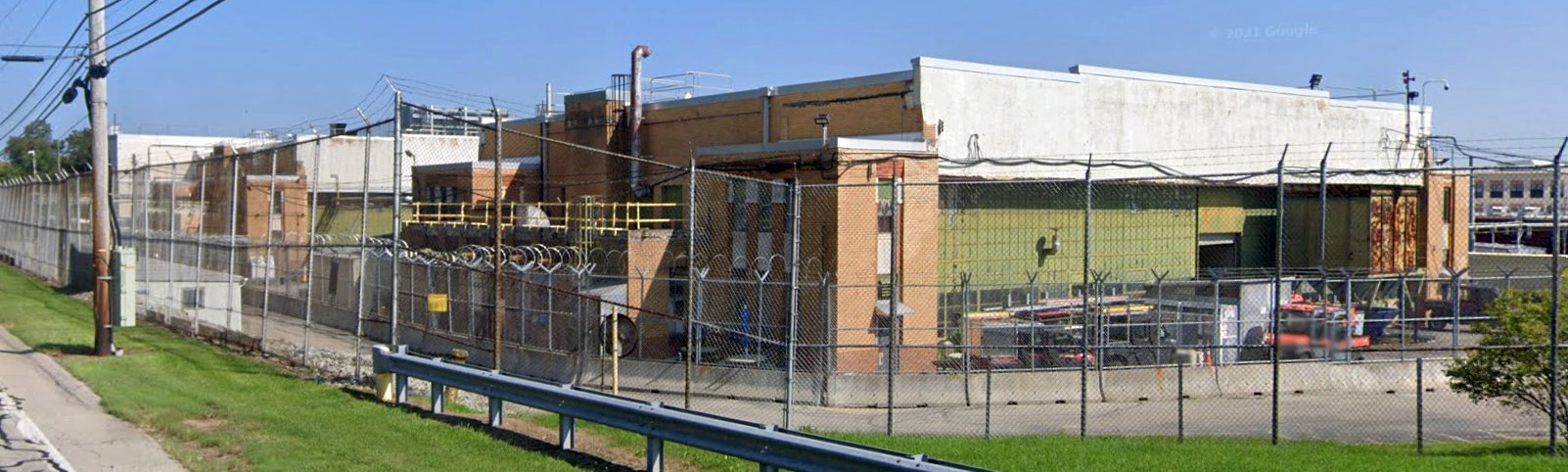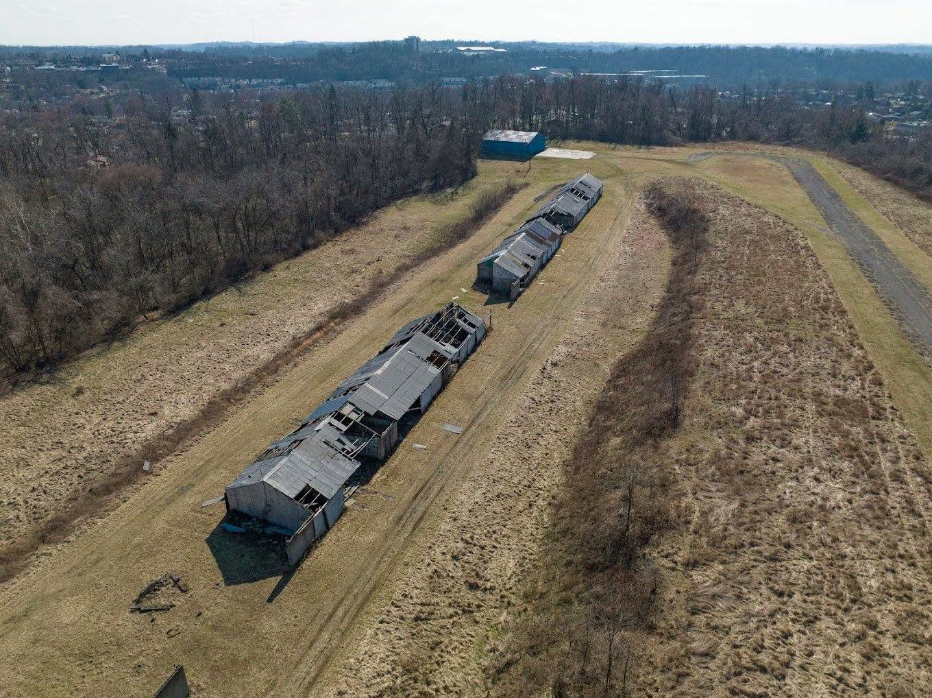 A 2023 aerial view looking south at the long row of Pittsburgh-Monroeville Airport hangars, many with missing roof sections.