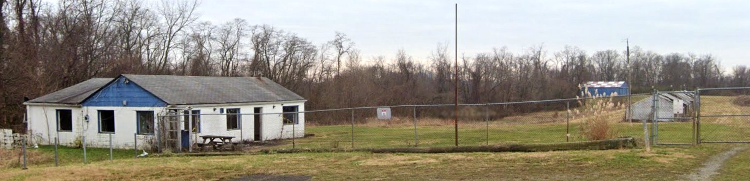 A sad November 2022 photo looking south showed Pittsburgh-Monroeville Airport's office & several hangars.