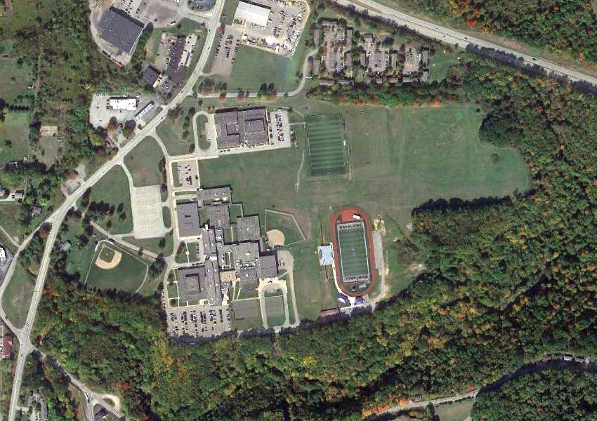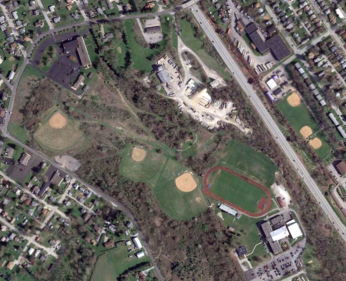 A 2007 aerial view looking southwest showed the Runway “31” markings & “PGH Metro” lettering which remain evident at the site of Pittsburgh Metro Airport.