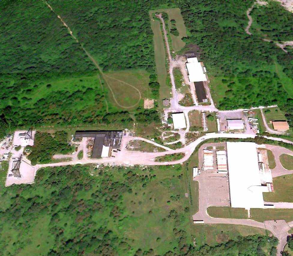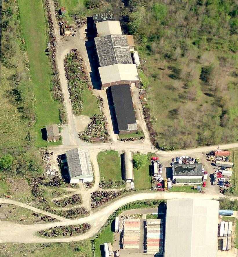 A 2016 aerial view looking north showed the former Pittsburgh Metro Airport runway & hangars remained intact, with trucks lining the former runway.