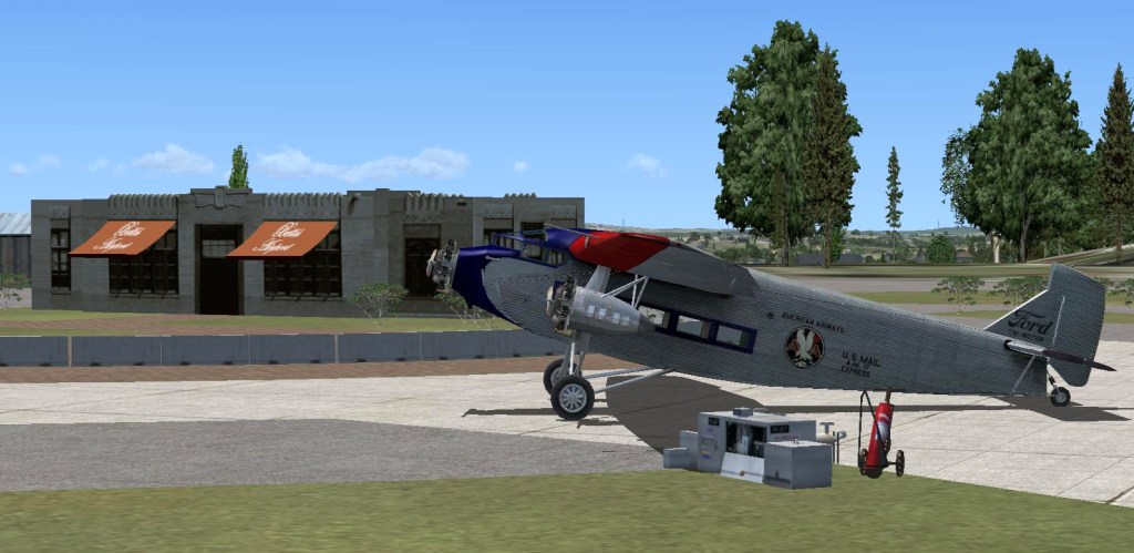 Two light single-engine planes were seen, 1 parked near the checkerboard-roofed hangar on the south side, and another on the midfield taxiway, perhaps on its way to the runway.