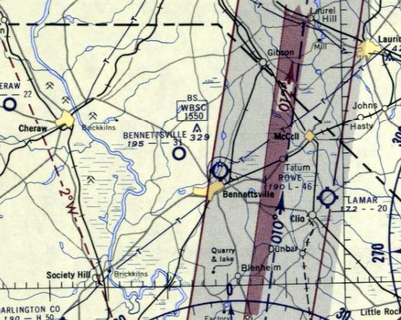 The last aeronautical chart depiction which has been located of Bennettsville Airport was on the August 1957 Charlotte Sectional Chart.