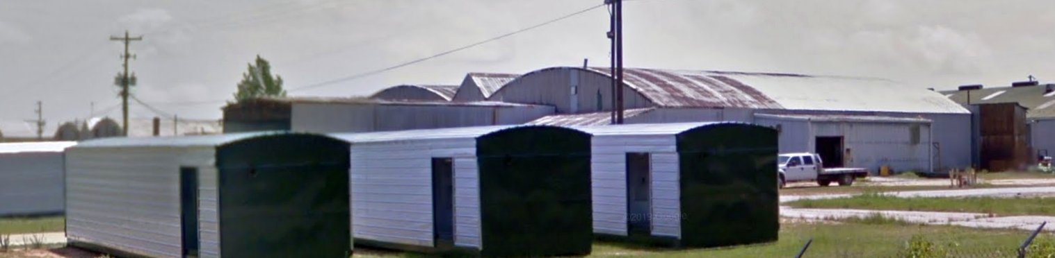 A 2014 photo looking northwest at the Palmer Field hangars, showing the characteristic WW2 hangar architecture of 2 arched-roofs connected by a peaked roof in between.