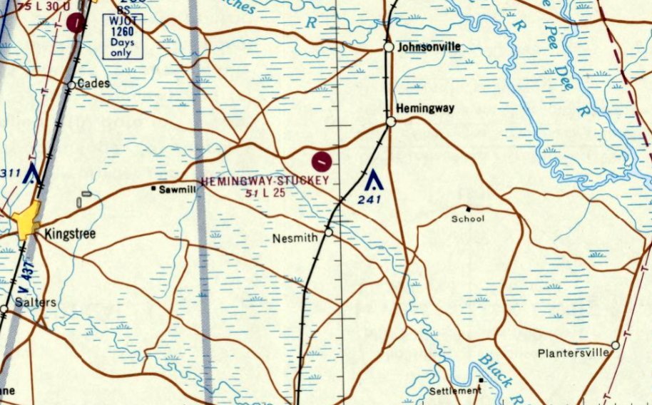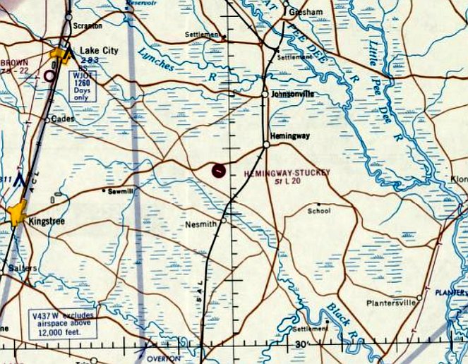The last aeronautical chart depiction which has been located of Hemingway-Stuckey Airport was on the February 1994 Savannah Sectional Chart.