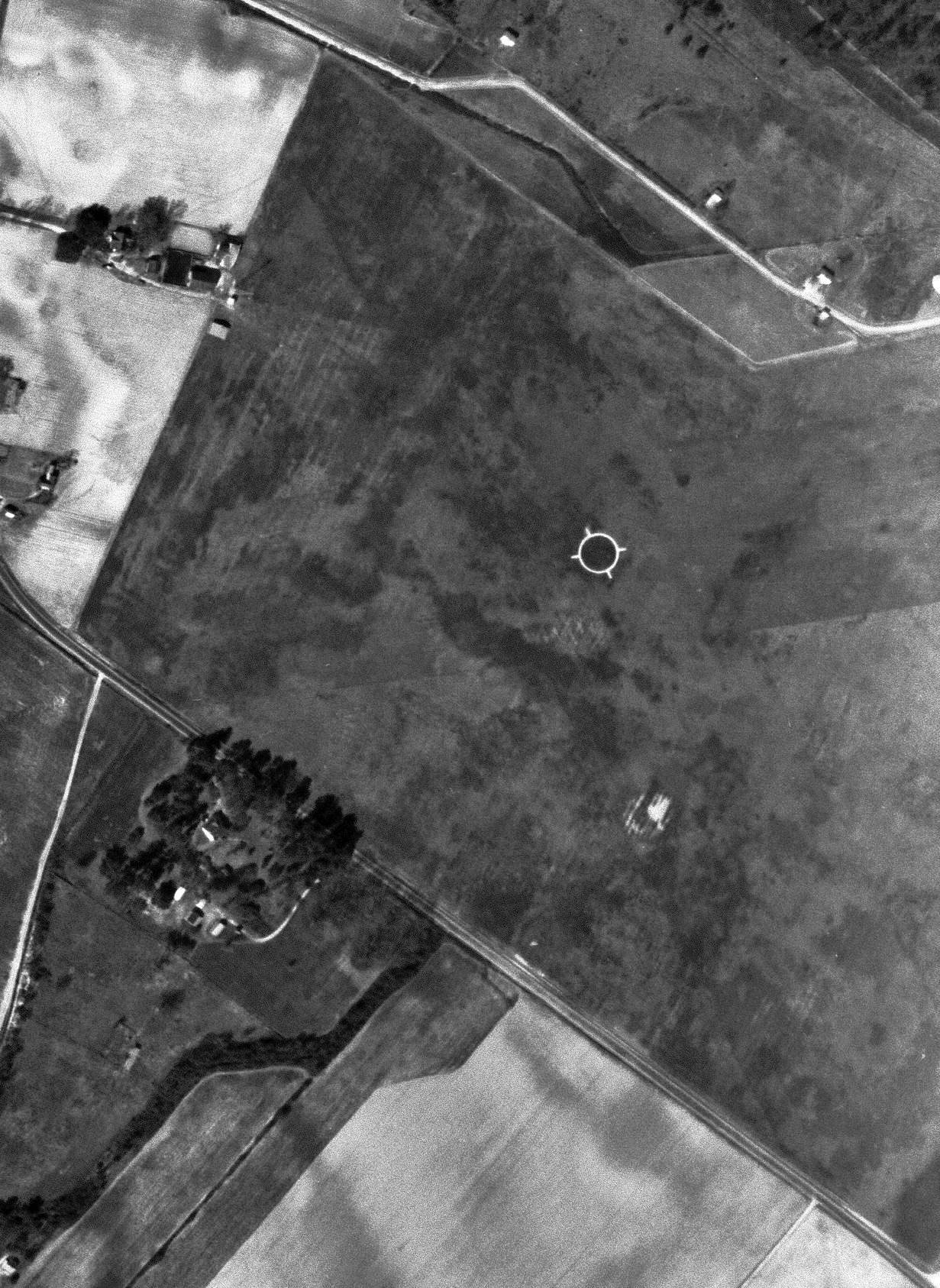 In a 1994 USGS aerial view looking northwest at the site of Lane Airport. the outline of a single east/west runway was still apparent in a large open field.