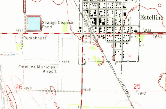 It depicted Estelline as having 2 perpendicular grass runways, with a few small buildings on the northeast side.