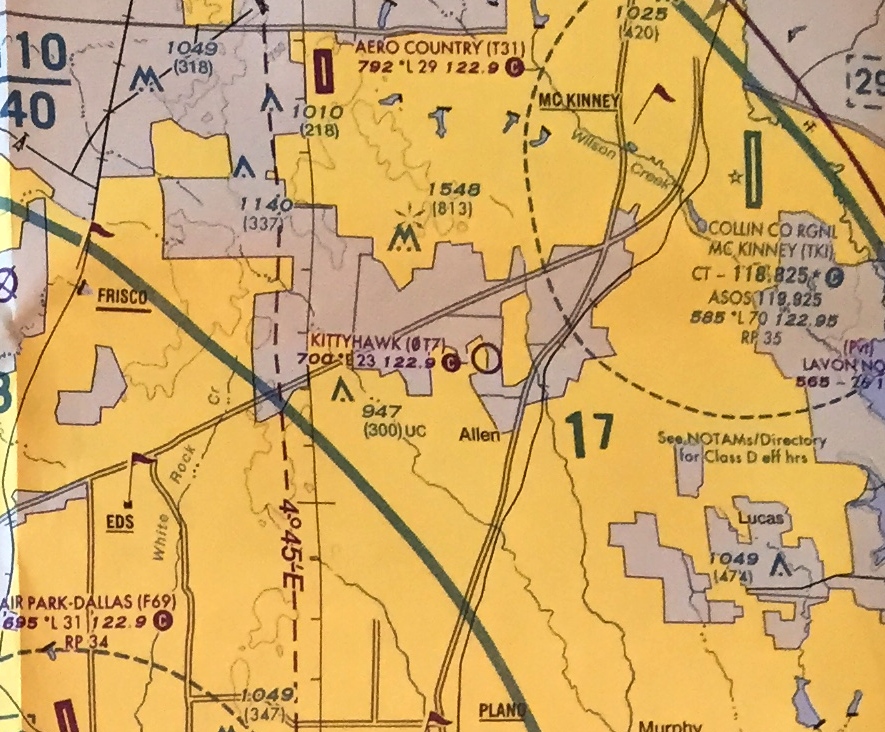 The last aeronautical chart depiction which has been located of Kittyhawk Airport was on the March 2009 Dallas Terminal Chart.