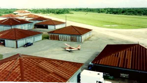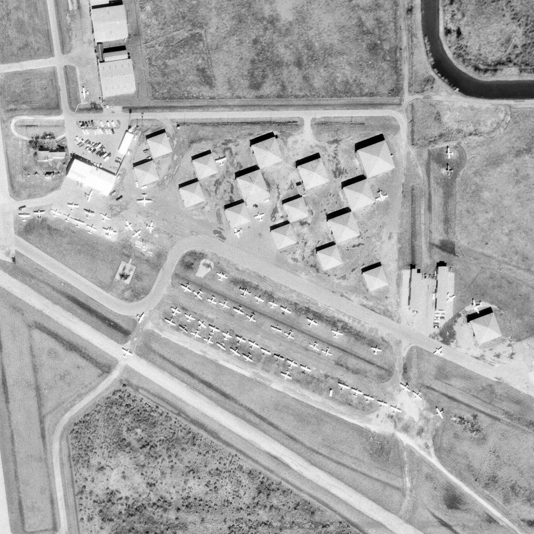 a distinctive cluster of diamond-shaped hangars, and several aircraft, including what appeared to be a DC-3.