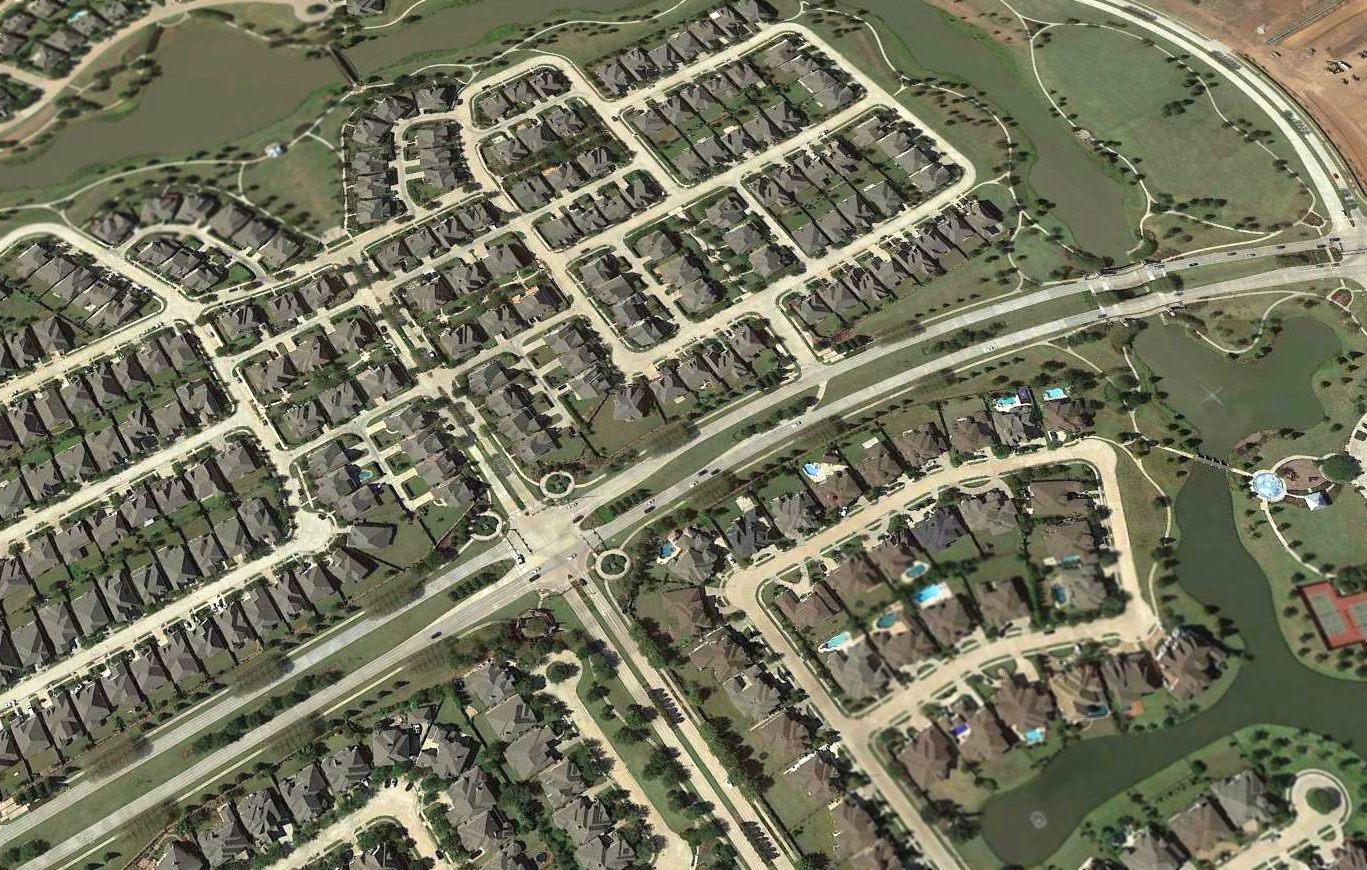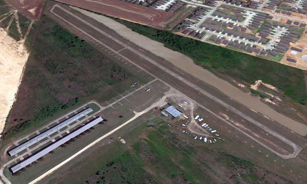 A 2014 aerial view showed the 2 hangars of King Air Airfield remained on the west side, but with Grand Parkway cutting through the center of the airfield site.