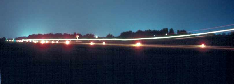 A 1979 photo by Robin Elston of a turboprop landing on Andrau's Runway 16 at night.