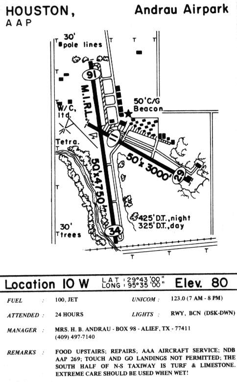 The 1980 Houston Terminal Chart depicted Andrau as having 2 paved runways, with the longest being 4,700'.