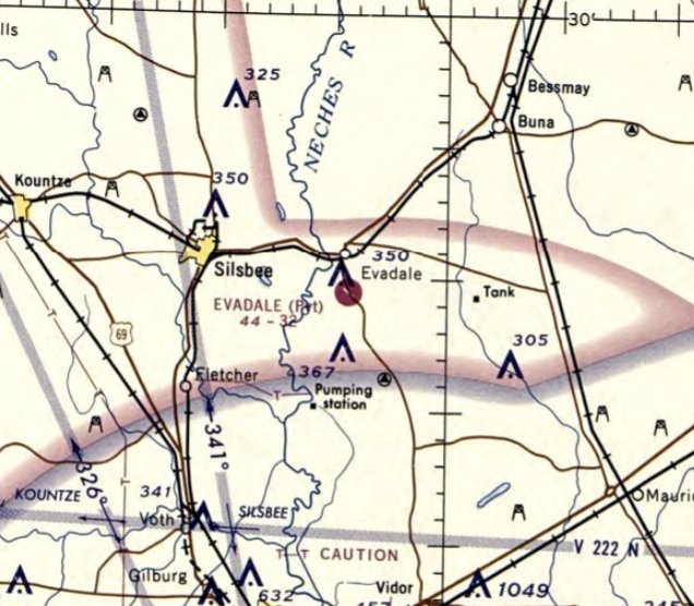 The earliest depiction which has been located of Evadale Airfield was on the April 1965 Beaumont Sectional Chart.