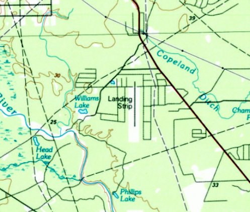 The 1985 USGS topo map depicted Williams Airport as a single north/south runway, labeled generically as “Landing Strip”.