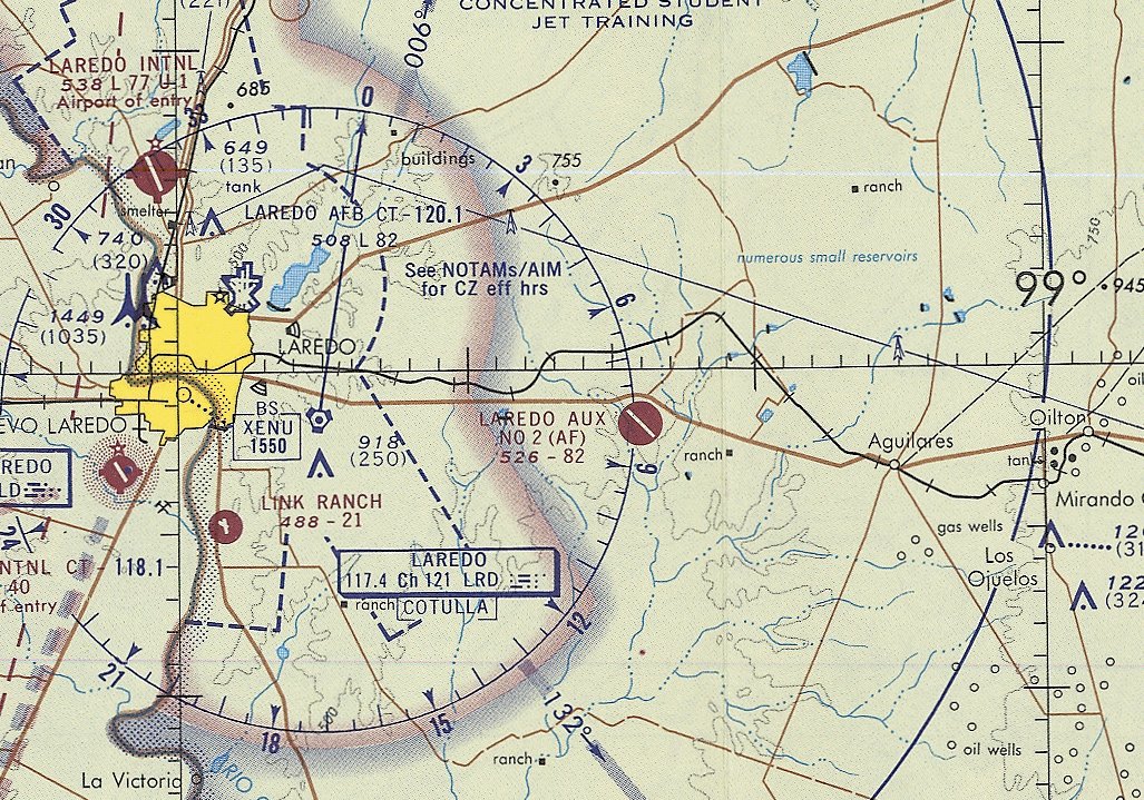 The earliest aeronautical chart depiction which has been located of Laredo Aux #2 was on the September 1956 Corpus Christi Sectional Chart.