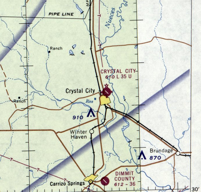 The last aeronautical chart depiction which has been located of Crystal City Airport was on the November 1967 Del Rio Sectional Chart.