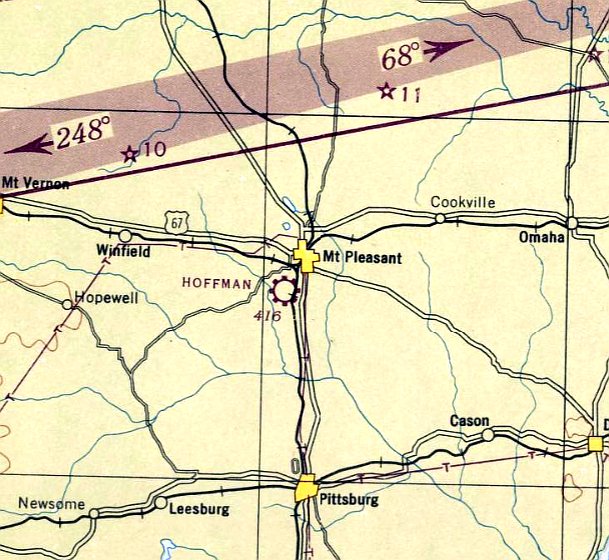 The last aeronautical chart depiction which has been located of the original Mt. Pleasant Airport was on the June 1968 Shreveport Sectional Chart,