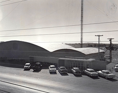 A still from a circa 1950s movie of an arch-roof hangar at the Fly'N Fish resort.