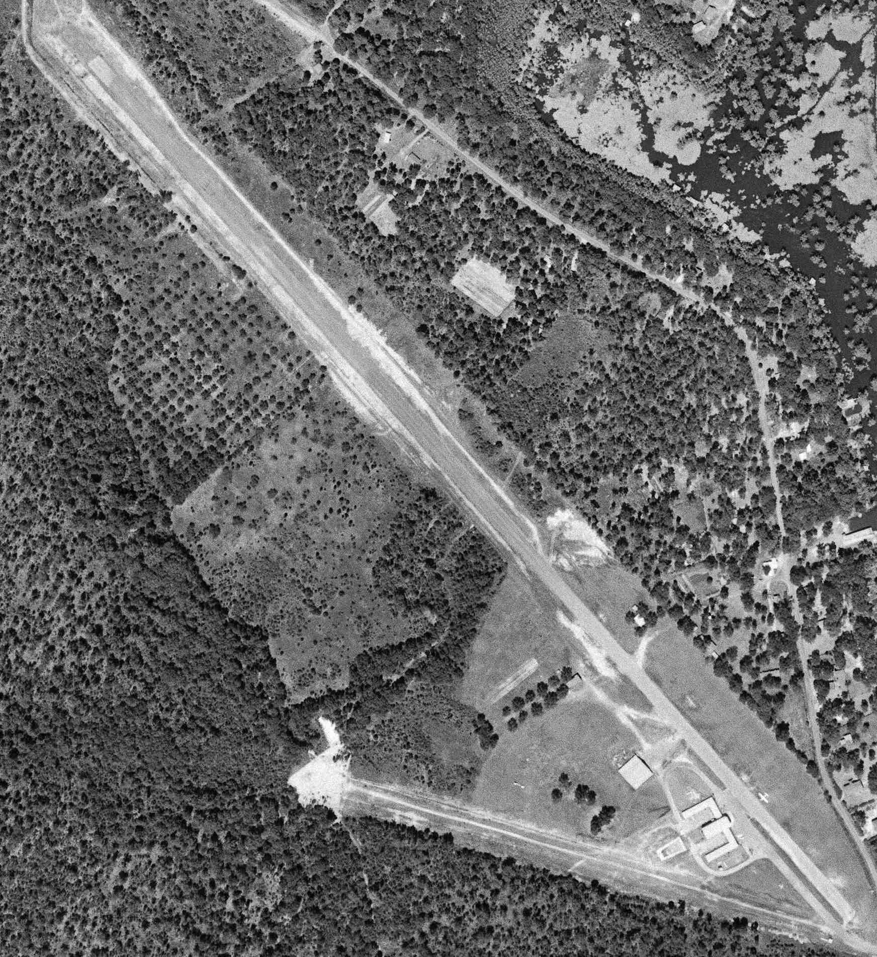 A 1994 aerial view looking northeast showed Beer Field remained intact, including the runway, hangar, and lodge building, but there were no aircraft visible on the field.