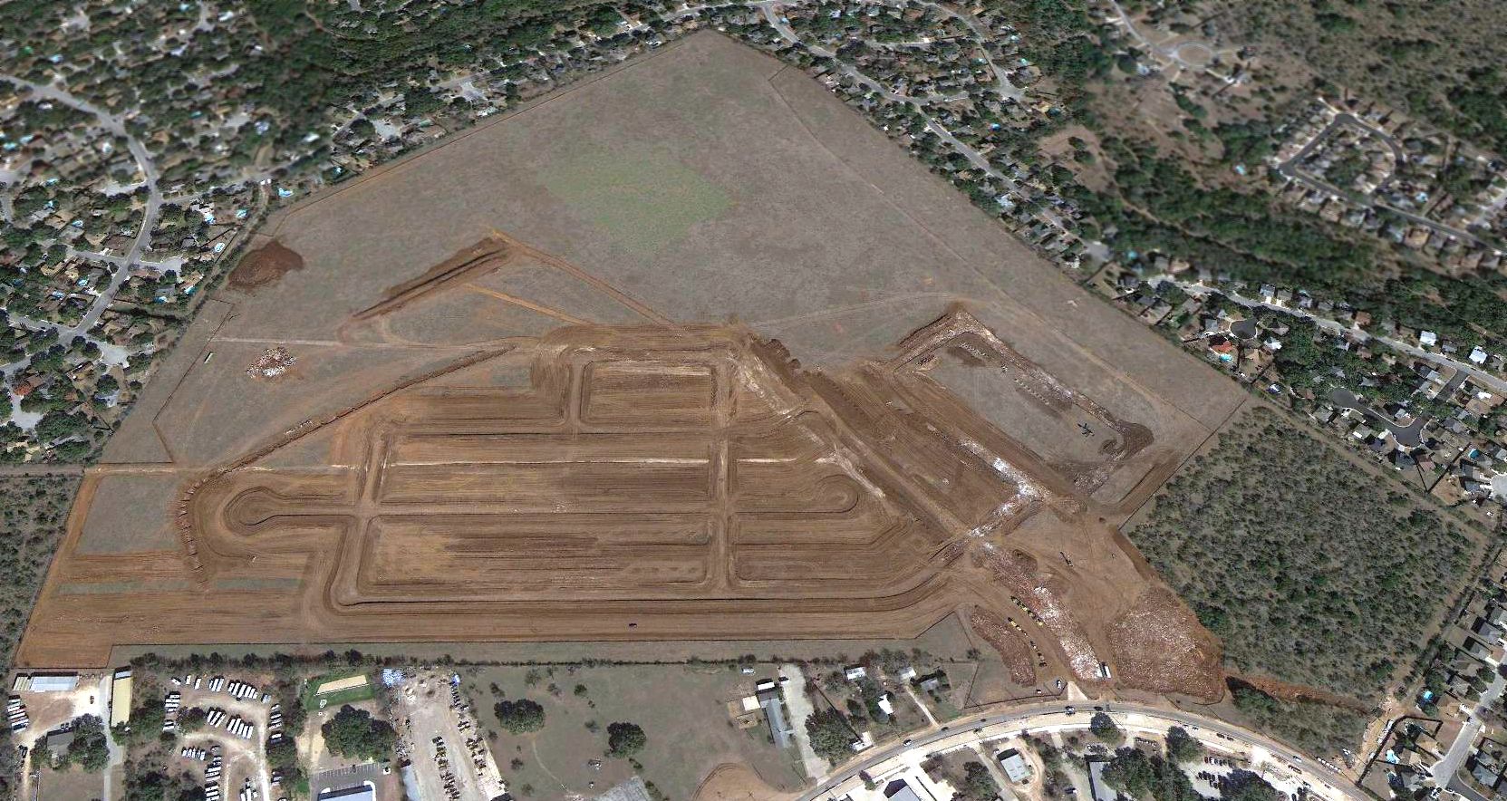 A 2018 aerial view looking northeast showed the Yates Airport property in the course of being developed with streets, presumably for more houses.