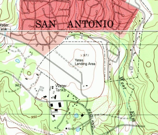 The last aeronautical chart depiction which has been located of Yates Airport was on the August 1949 San Antonio Sectional Chart.