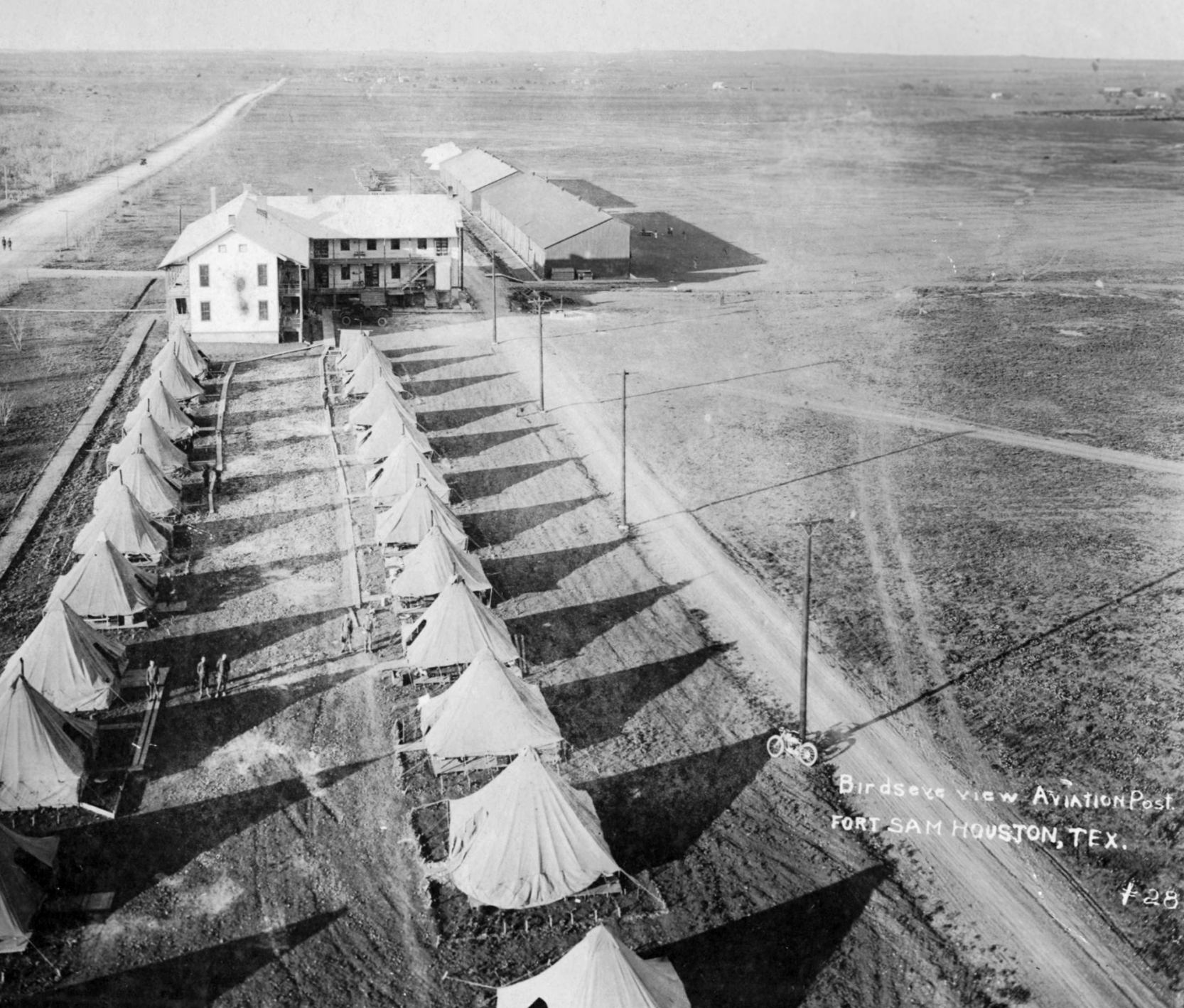 A circa 1910s aerial view (courtesy of John Manguso) looking north at tents & hangars along the west side of Dodd Field, captioned “Aviation Post, Fort Sam Houston”.