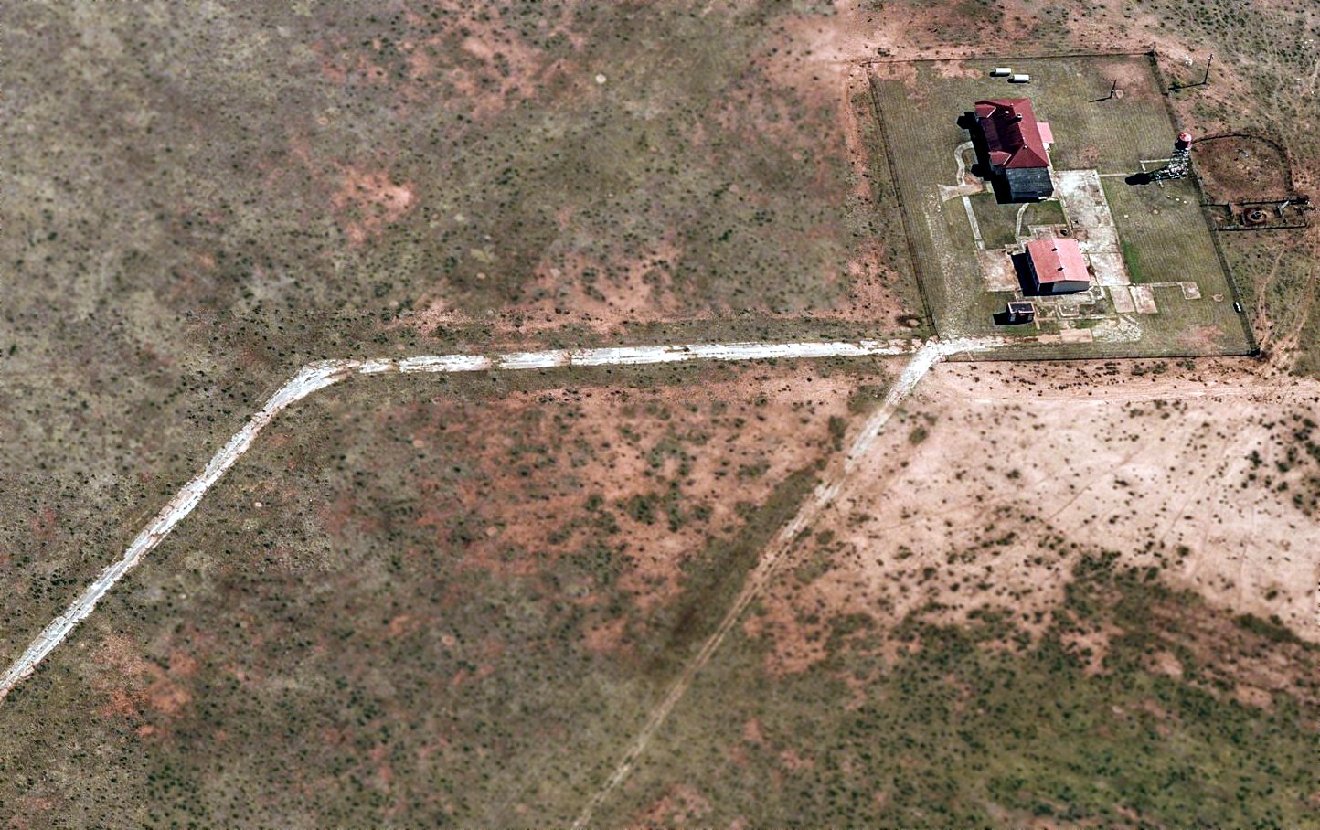 A 2017 aerial view looking northeast depicted Yates Airport in the same condition as seen in 1995, with the paved runway still recognizable though deteriorated, and the closed-runway “X” symbol still recognizable.
