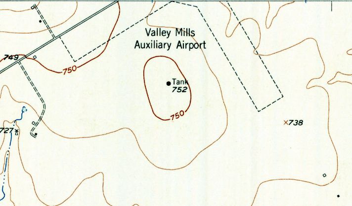 The 1957 USGS topo map depicted “Valley Mills Auxiliary Airport” as having 2 perpendicular unpaved runways