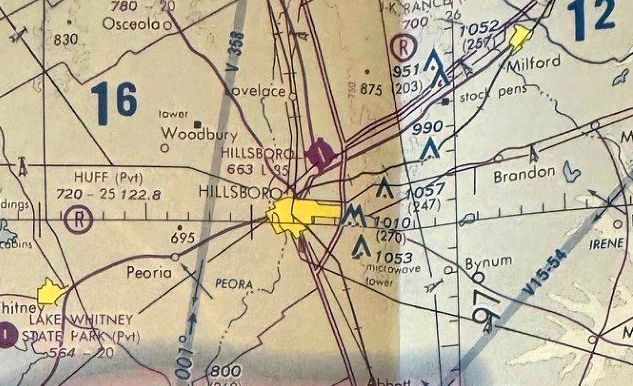 The last aeronautical chart depiction which has been located of Hillboro Municipal Airport was on the December 1985 San Antonio Sectional Chart.