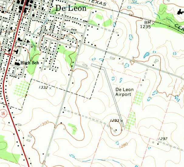 It depicted De Leon Airport as having a single paved northwest/southeast runway, with a ramp & a few small buildings on the northwest side.
