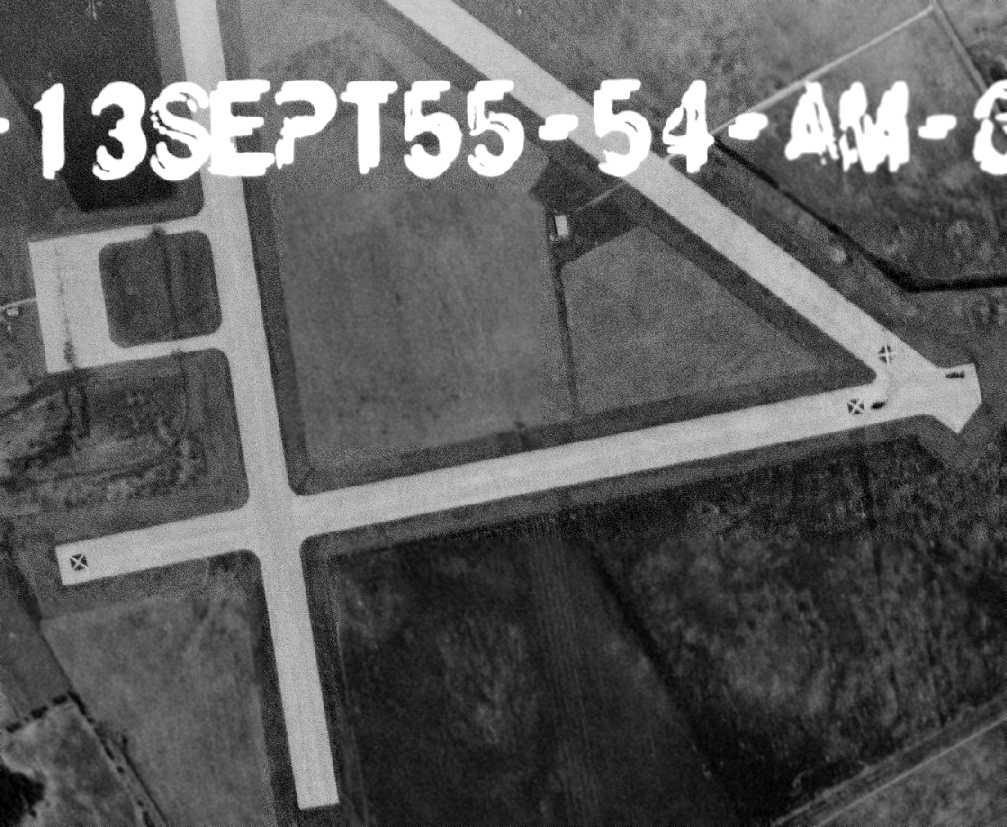 A 1955 aerial view depicted an open grass area, with no recognizable sign of an airfield.