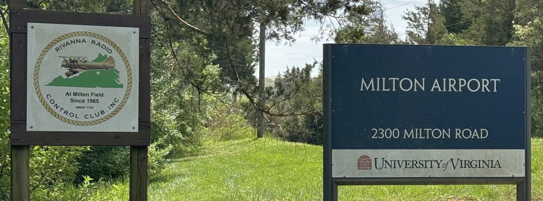 A 4/20/24 photo by Paul Freeman of the signs for Milton Airport & its Rivanna Radio Control Club field.