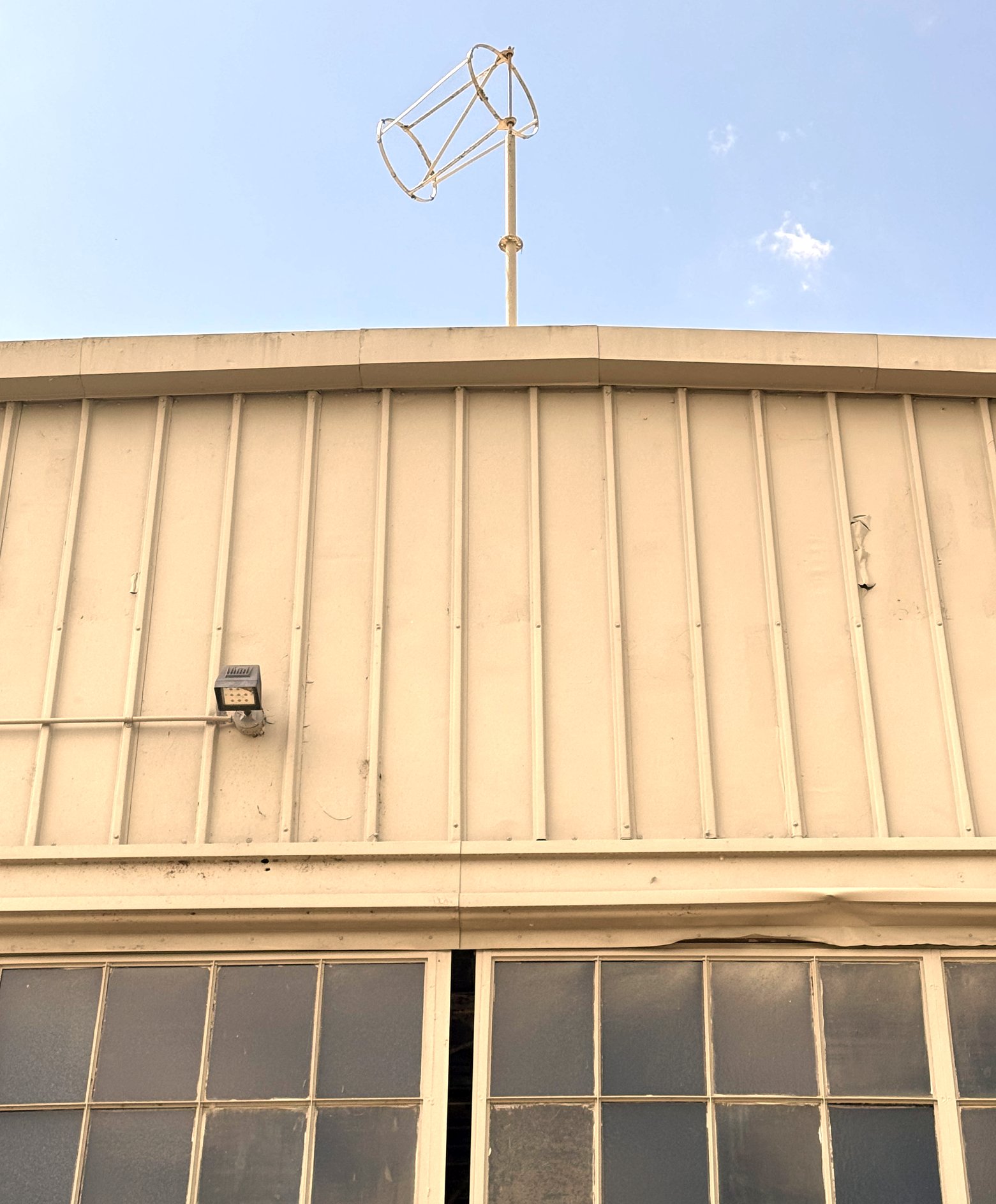 A 4/20/24 photo by Paul Freeman looking at the windsock frame mounted atop the former Milton Field hangar.