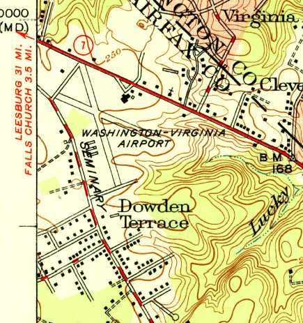 The 1951 USGS topo map depicted Washington-Virginia Airport as having 2 paved runways, with several buildings on the northeast & southwest sides.