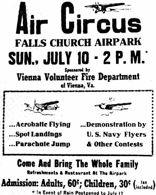 An advertisement for the 7/10/49 Air Circus held at Falls Church Airpark (from the Styles Public Library, courtesy of Charlie Davis).