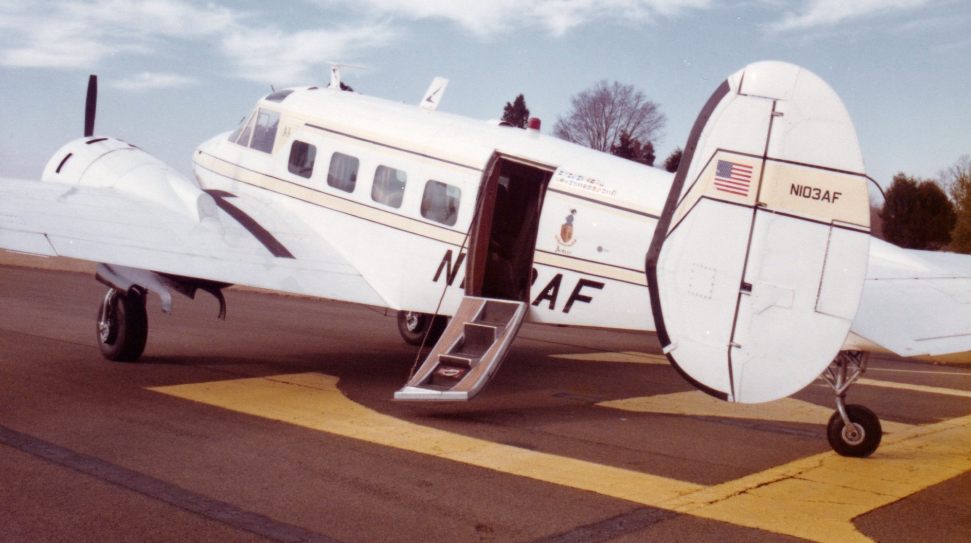A 1975 photo by Greg Wesier of Airlie Foundation's Twin Beech Beech 18 N103AF at Airlie Airport, filming a trip to Alaska.