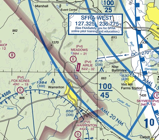 The 2023 Washington Terminal Chart depicted Airlie as an abandoned airfield.