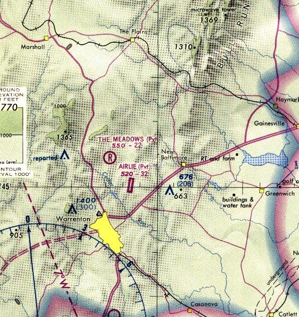 The 1975 Washington Terminal Aeronautical Chart depicted Airlie Airport as a private airfield having a single 3,200' paved northeast/southwest runway.